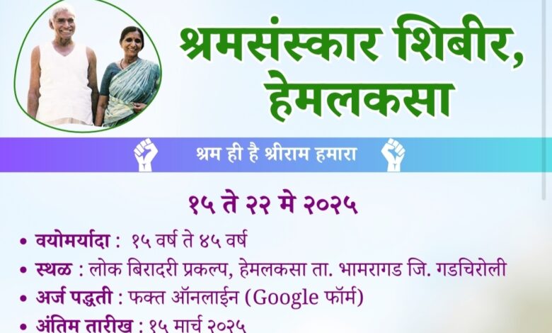 शिबिरार्थीना ई-मेल, भ्रमणध्वनीच्या माध्यमातून कळवण्यात येईल. अंतिम तारीख ५ मार्च आहे. नोंदणीसाठी https://forms. gle/8 UmSZJbamrzYTd7V7 या लिंकवर संपर्क साधावा. अधिक माहितीसाठी सचिन मुक्कावार ७५८८७७२८५८, दीपक सुतार ८२७५०४७१९२ किंवा ई-मेल shramsanskar2025@gmail.co m किंवा संकेतस्थळ lokbiradariprakalp.org येथे संपर्क साधावा.